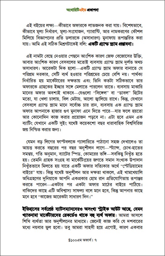 অ্যালেক্স হরমোযি’র $100M Offers বইটি একটি দারুণ ব্যবসায়িক নির্দেশিকা, যা উদ্যোক্তাদের এবং ব্যবসায়িক পেশাদারদের জন্য অত্যন্ত কার্যকর। বইটিতে উদ্যোক্তাদের জন্য কিছু সুনির্দিষ্ট গাইডলাইন প্রাকটিক্যালি দেখানো হয়েছে, যেখানে তারা কীভাবে তাদের অফারগুলো মূল্যবান করে বিক্রির পরিমাণ বাড়াতে পারে, সে সম্পর্কে বিস্তারিত ধারণা স্পষ্ট করা হয়েছে।