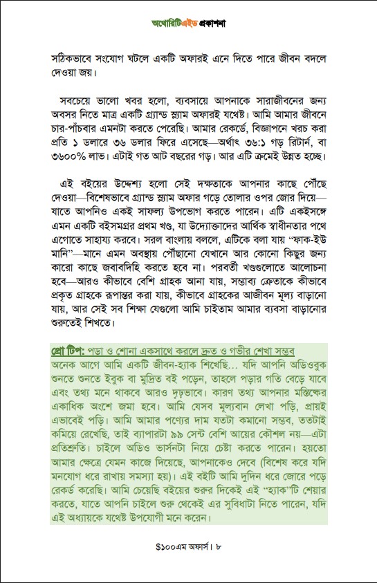 Authority Aid কে ধন্যবাদ সহজ বাংলা অনুবাদের মাধ্যমে বইটি উপহার দেয়ার জন্য। অপেক্ষায় আছি $১০০এম লিডস বইটির জন্য।
